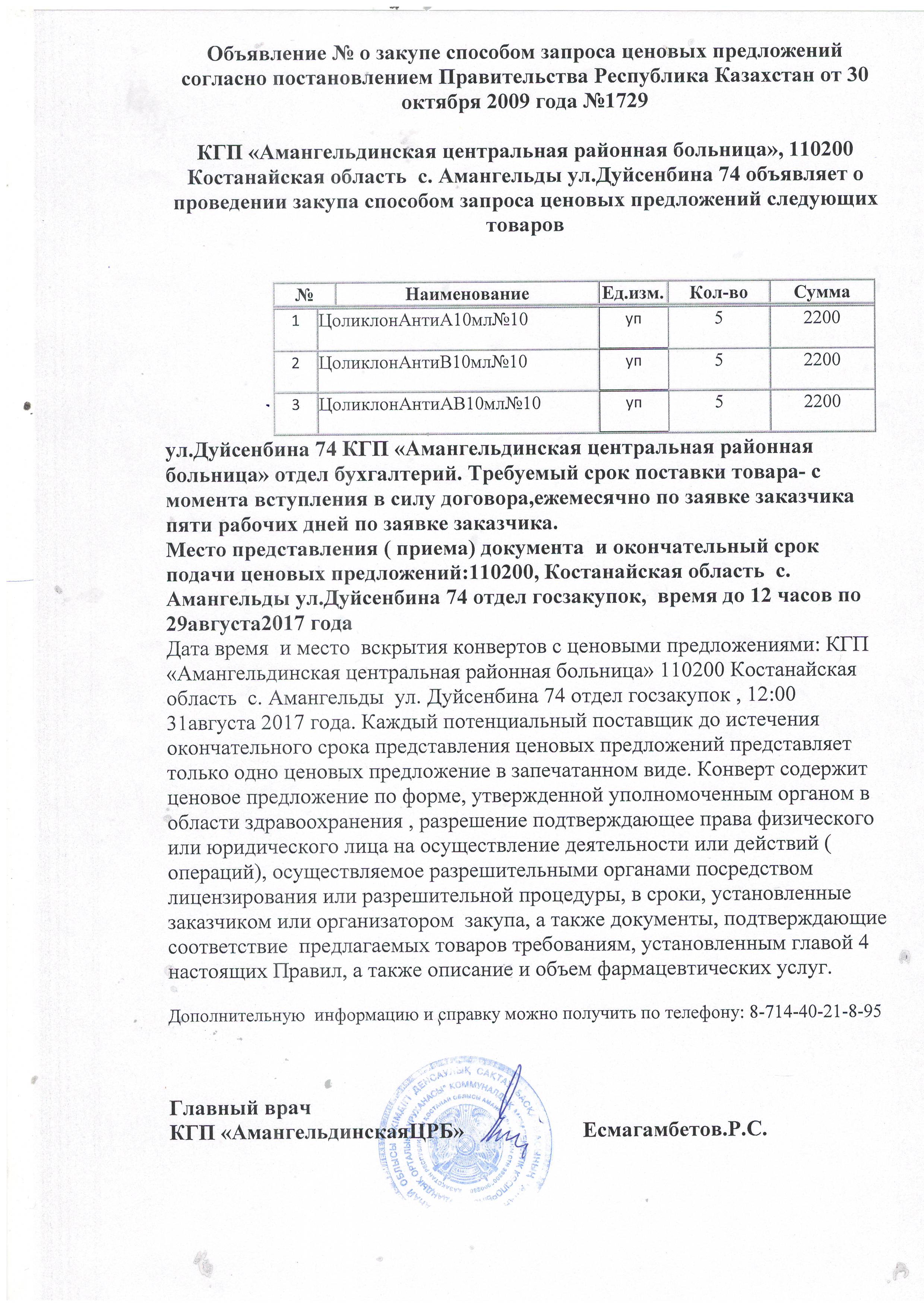 Объявление о закупе способом запроса ценовых предложений согласно постановлением Правительства Республика Казахстан от 30 октября 2009 года №1729