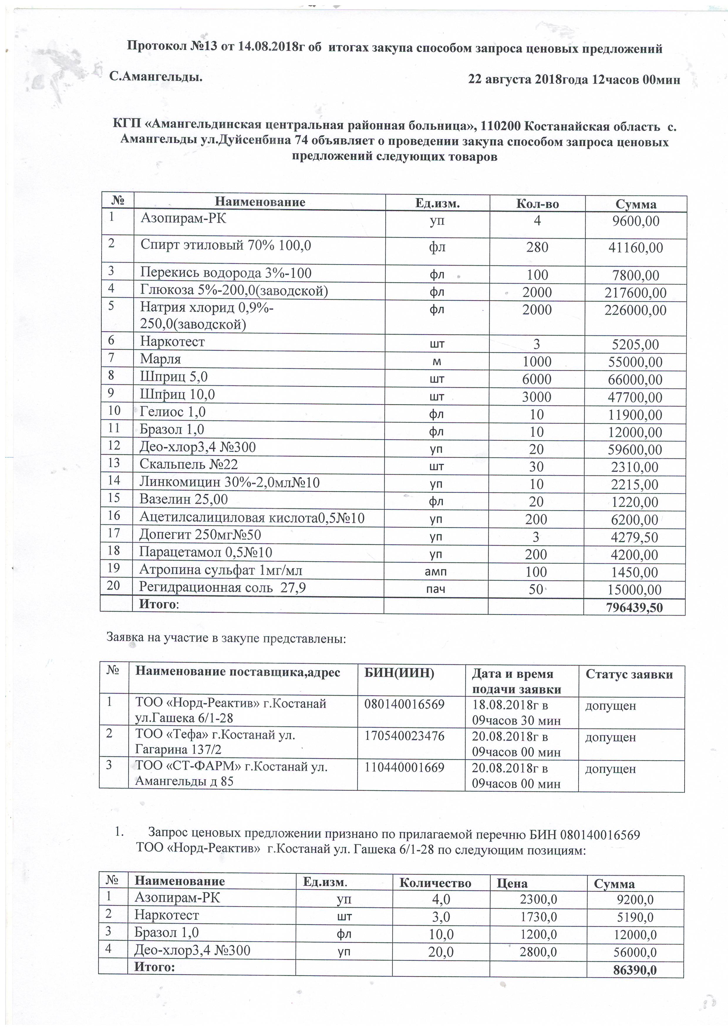 Протокол №13 от 14.08.2018 г. об итогах закупа способом запроса ценовых предложений