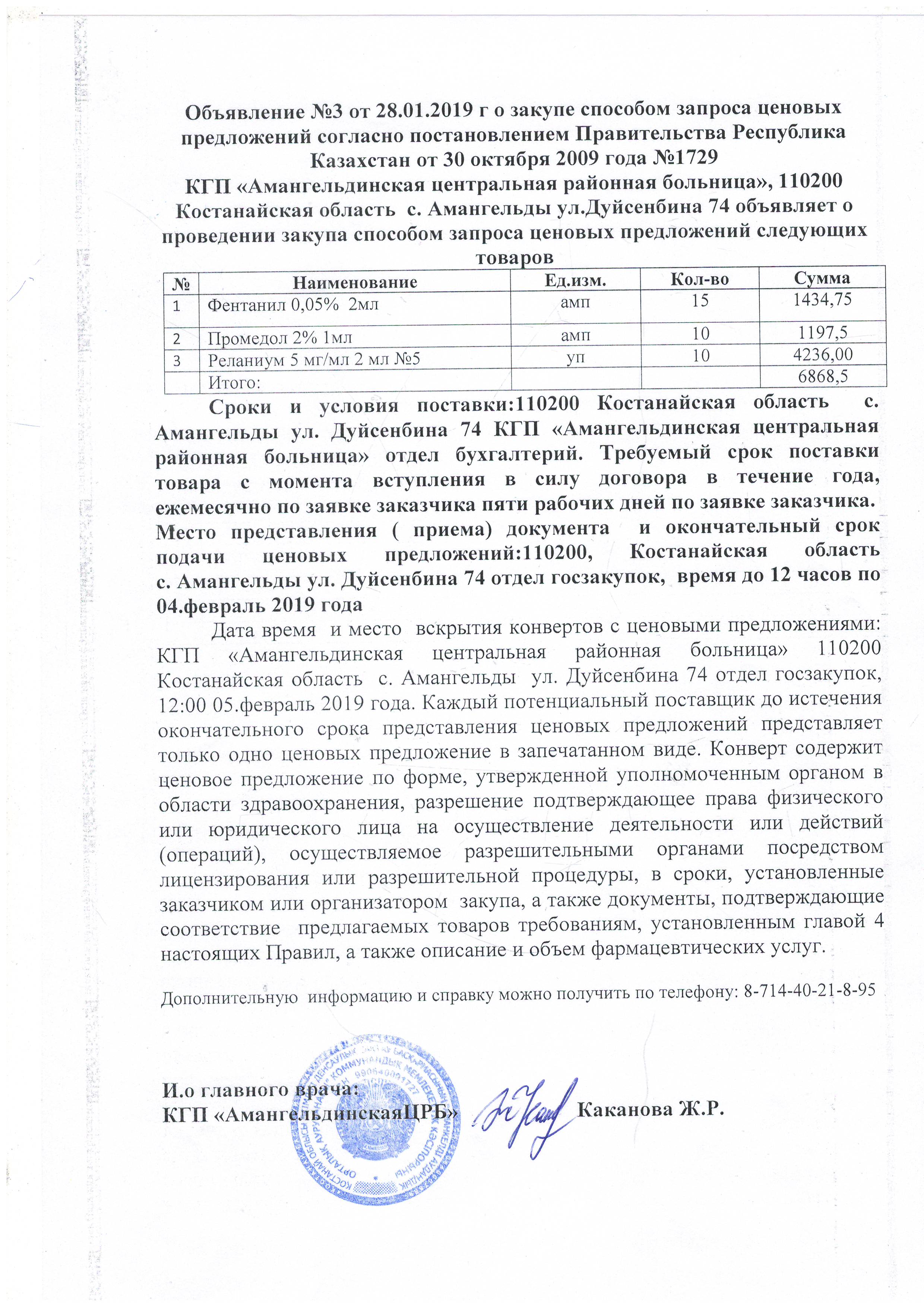 Объявление №3 от 28.01.2019 о закупе способом запроса ценовых предложений