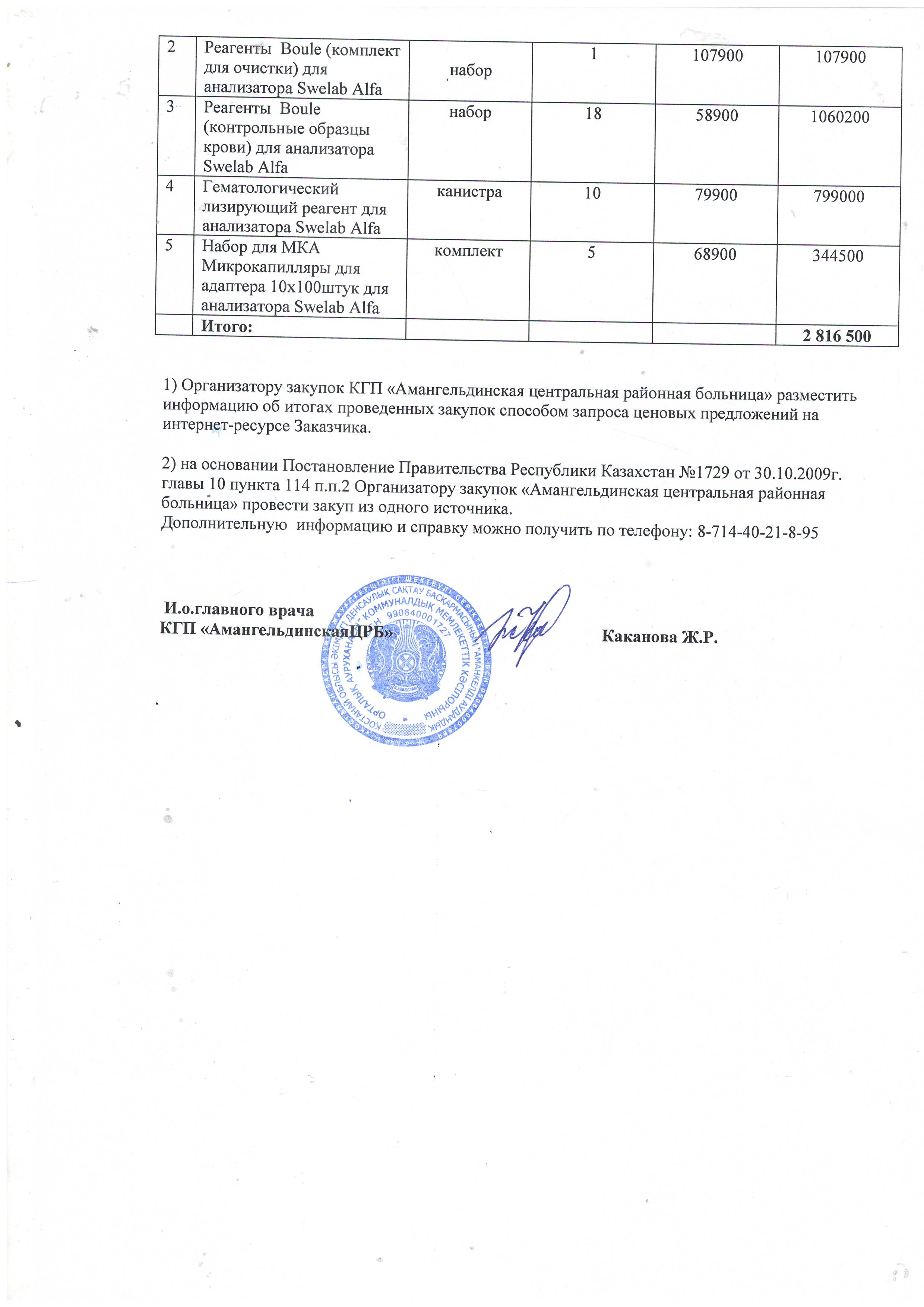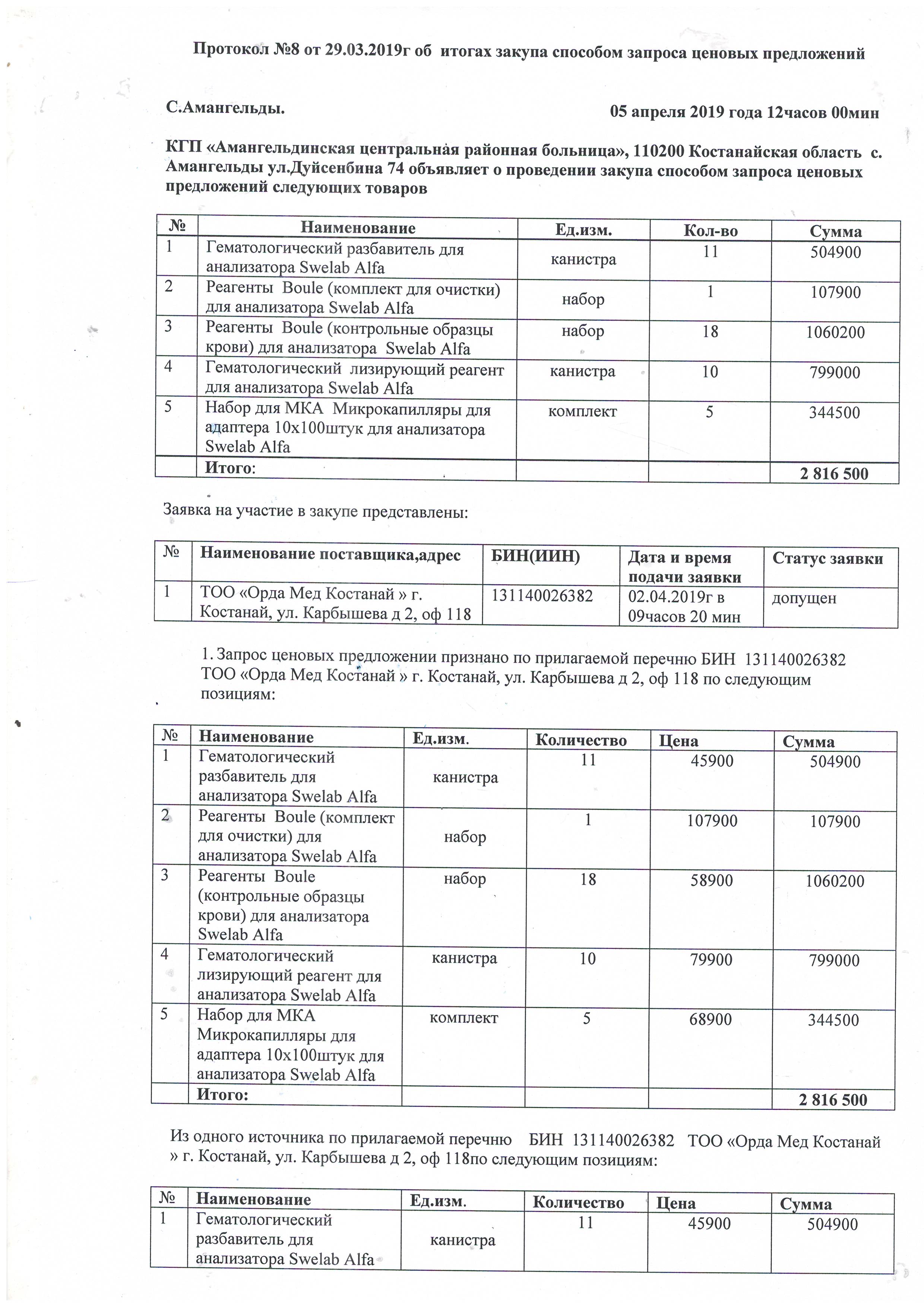 Протокол №8 об итогах закупа способом запроса ценовых предложений 05.04.2019 г
