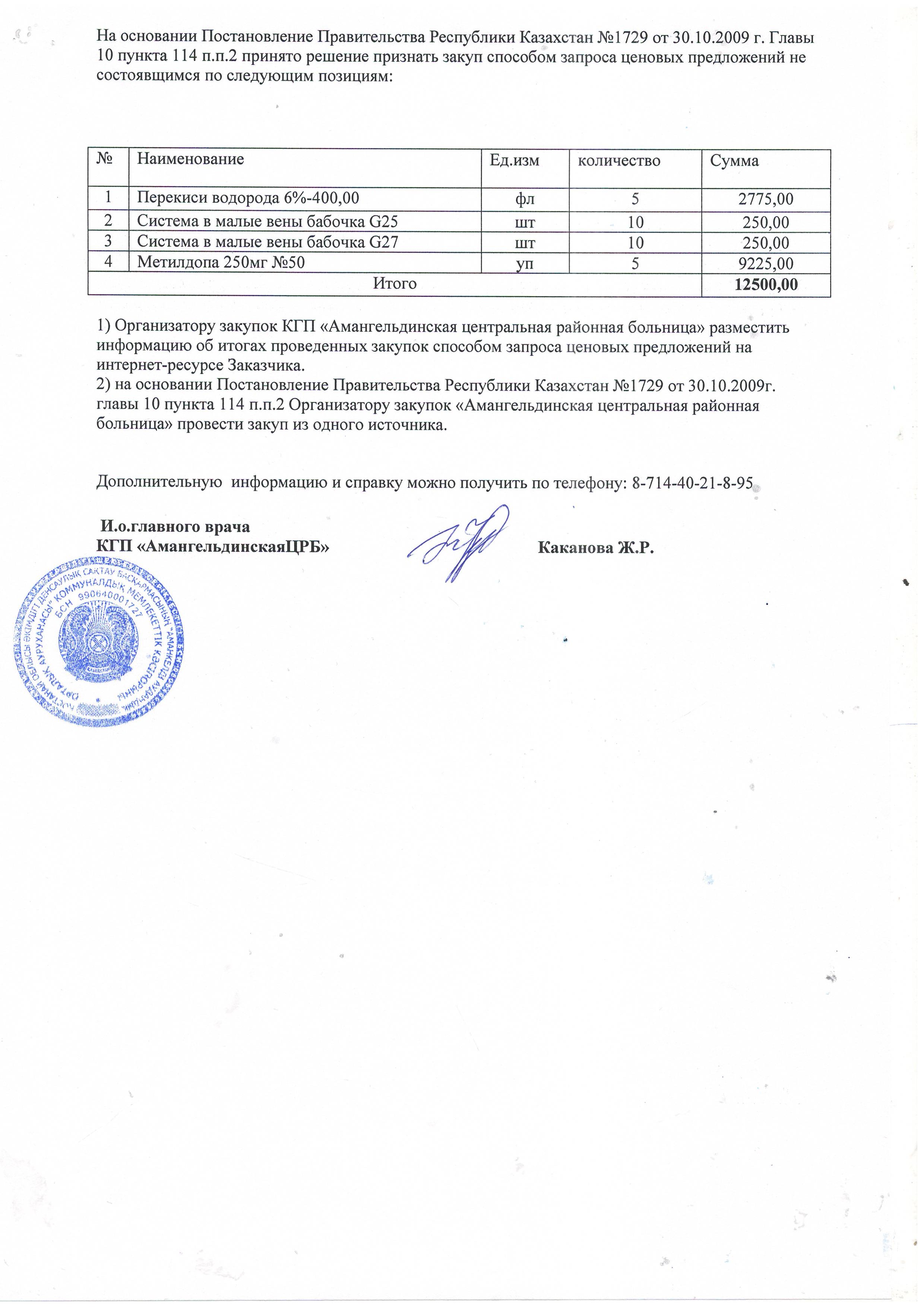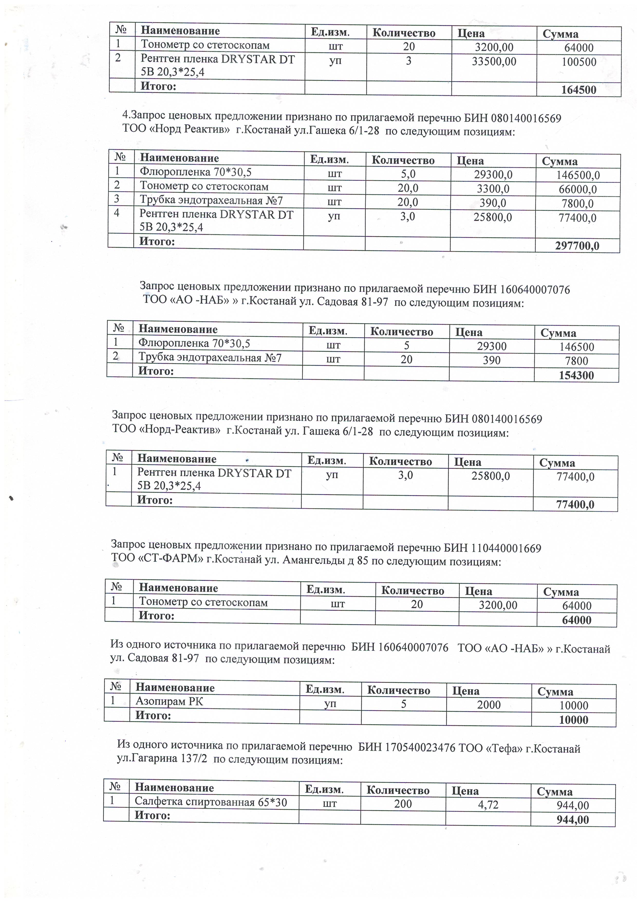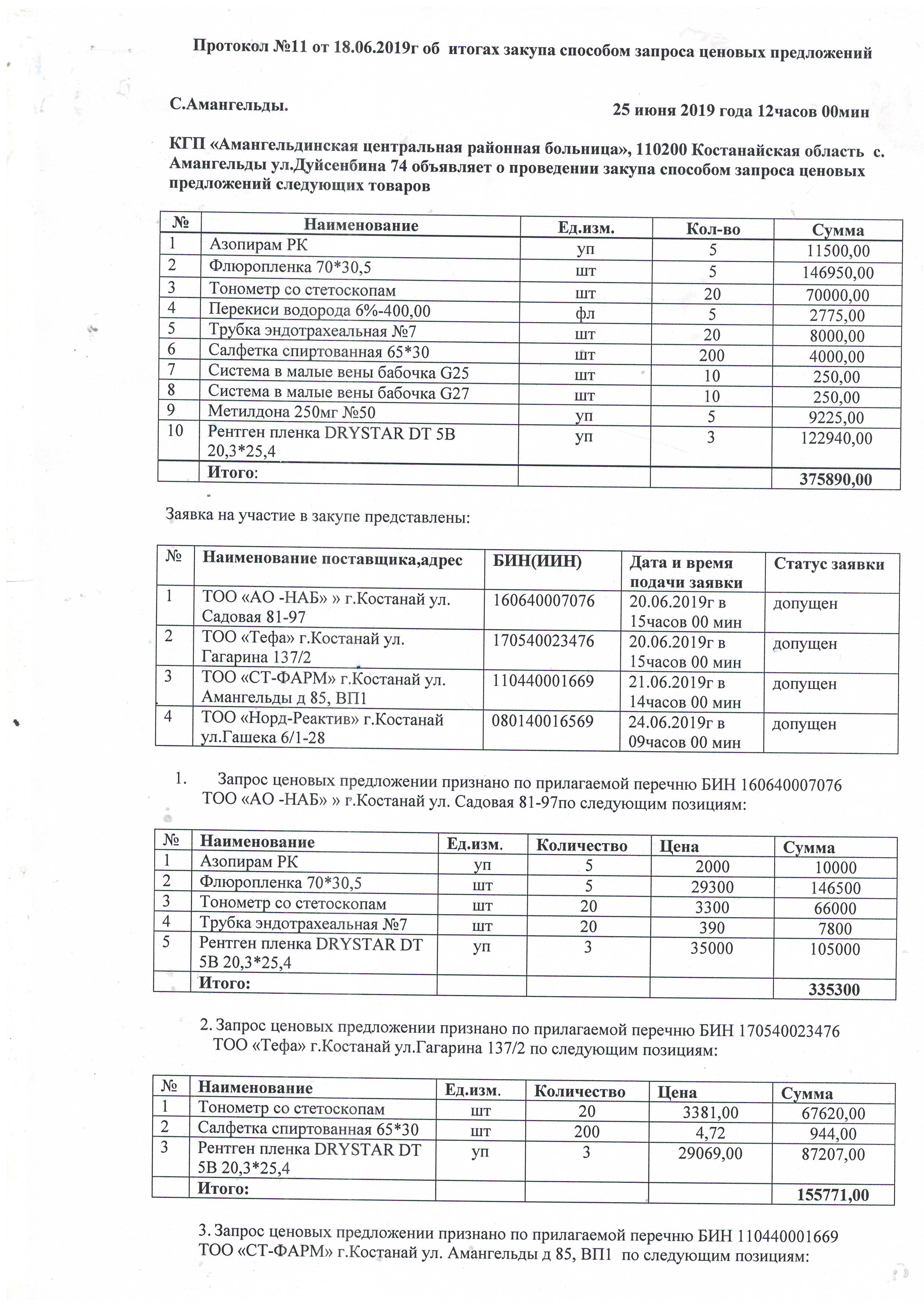 Протокол №11 об итогах закупа способом запроса ценовых предложений от 25.06.2019г
