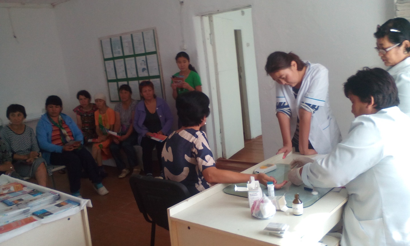 В соответствии с Планом мероприятий реализации Государственной программы развития здравоохранения «Денсаулық» на 2016-2019 годы, и в целях привлечения внимания общественности, к проблеме сохранения и укрепления здоровья сельского населения сотрудником ЗОЖ А.О.Ибраевой была организована и проведена широкомасштабная акция в сельских округах Есирь, Карасу, Урпек с определением уровня глюкозы, холестерина, измерением артериального давления и пульса, определением индекса массы тела, с консультацией специалистов: хирург-онколог, ВОП, психолог и медсестры доврачебного кабинета с распространением информационно-образоватеьного материала.